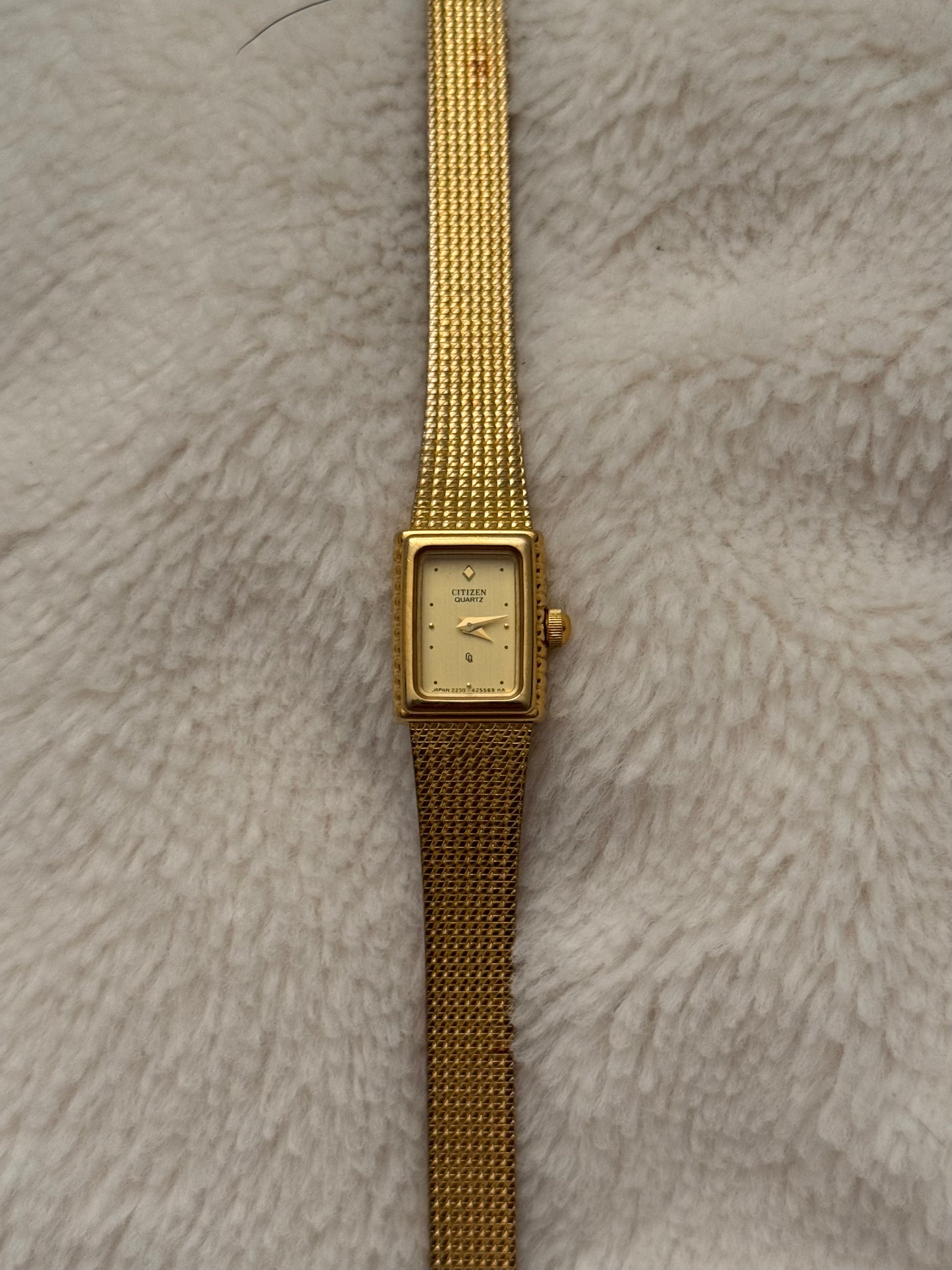 - notes: super beautiful vintage citizen with an gold dial and ribbed case. has a textured integrated bracelet.