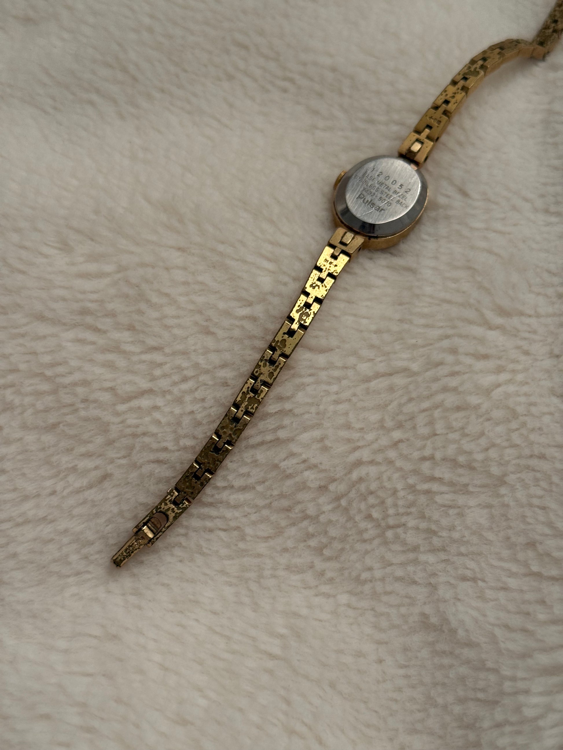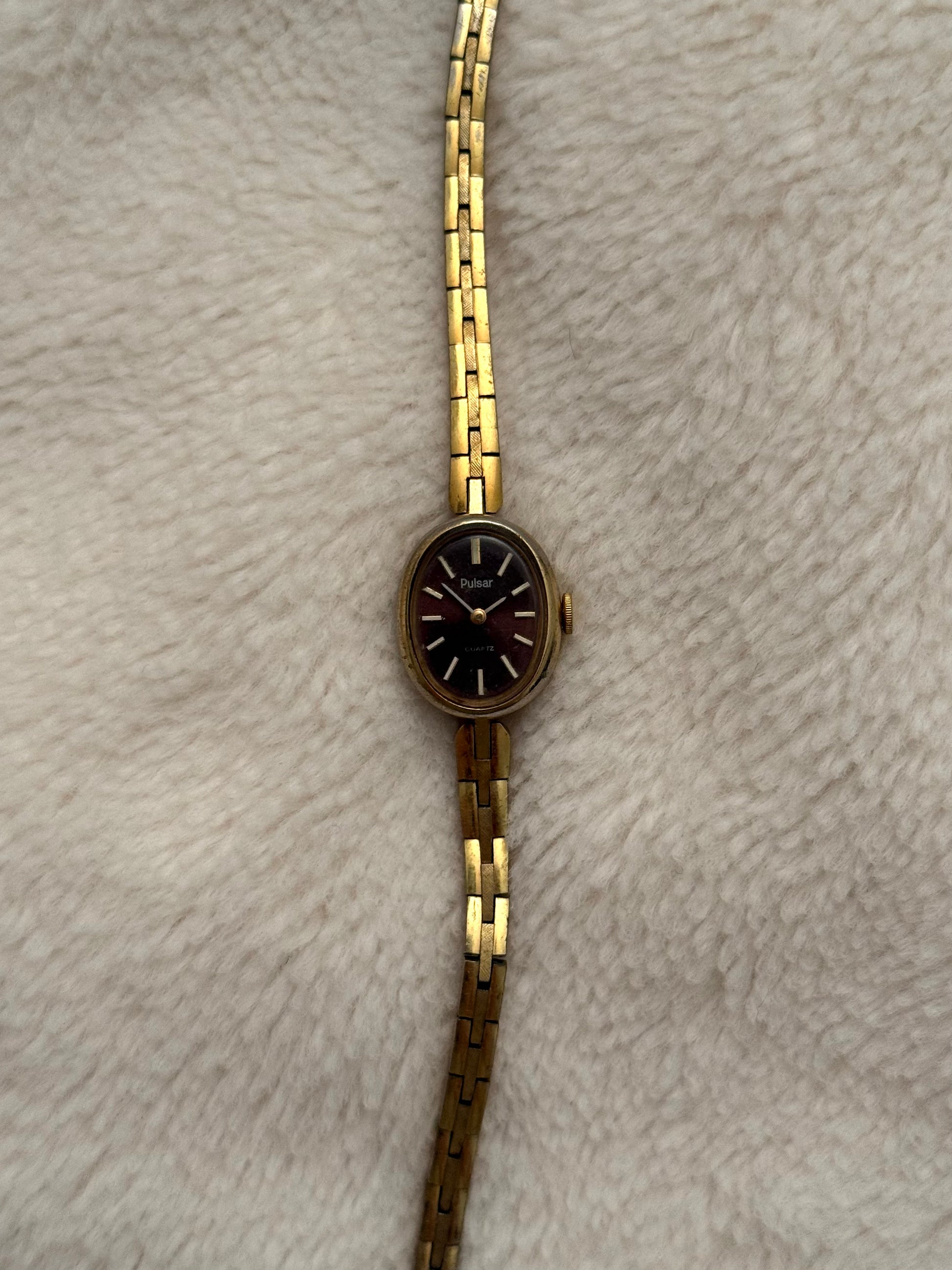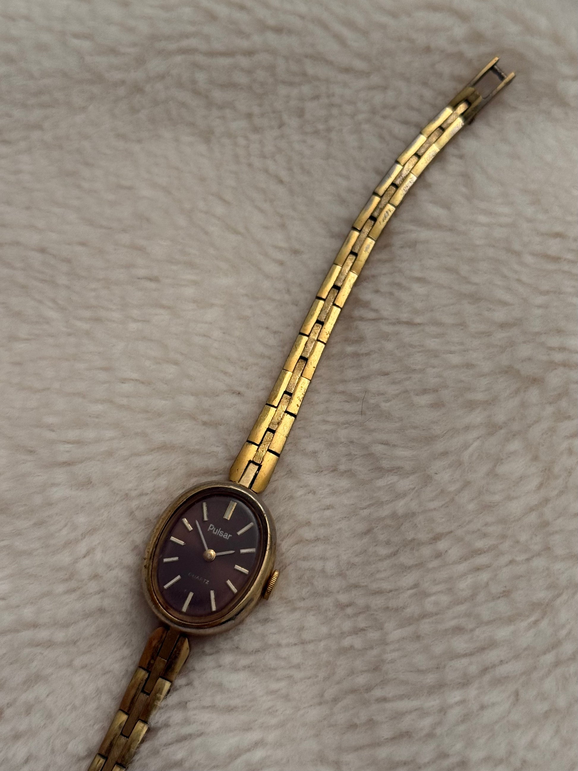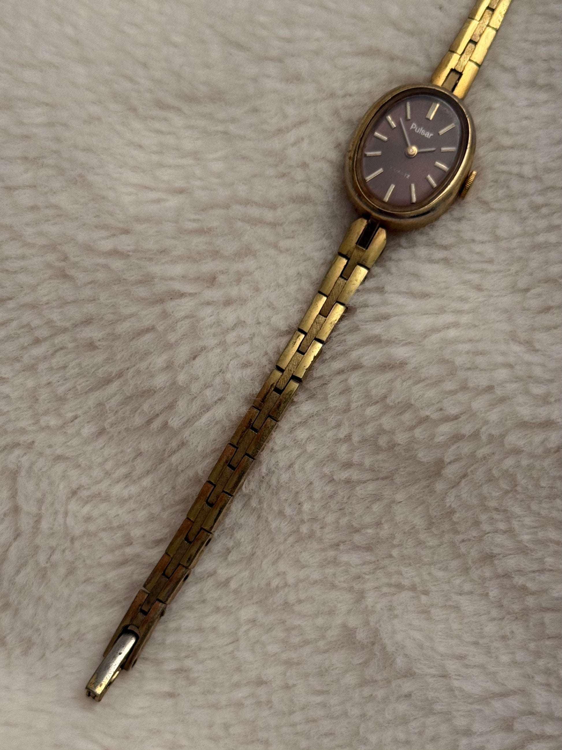- notes: super beautiful vintage pulsar with an incredible brown dial and thin tapered bracelet. a very dainty piece.