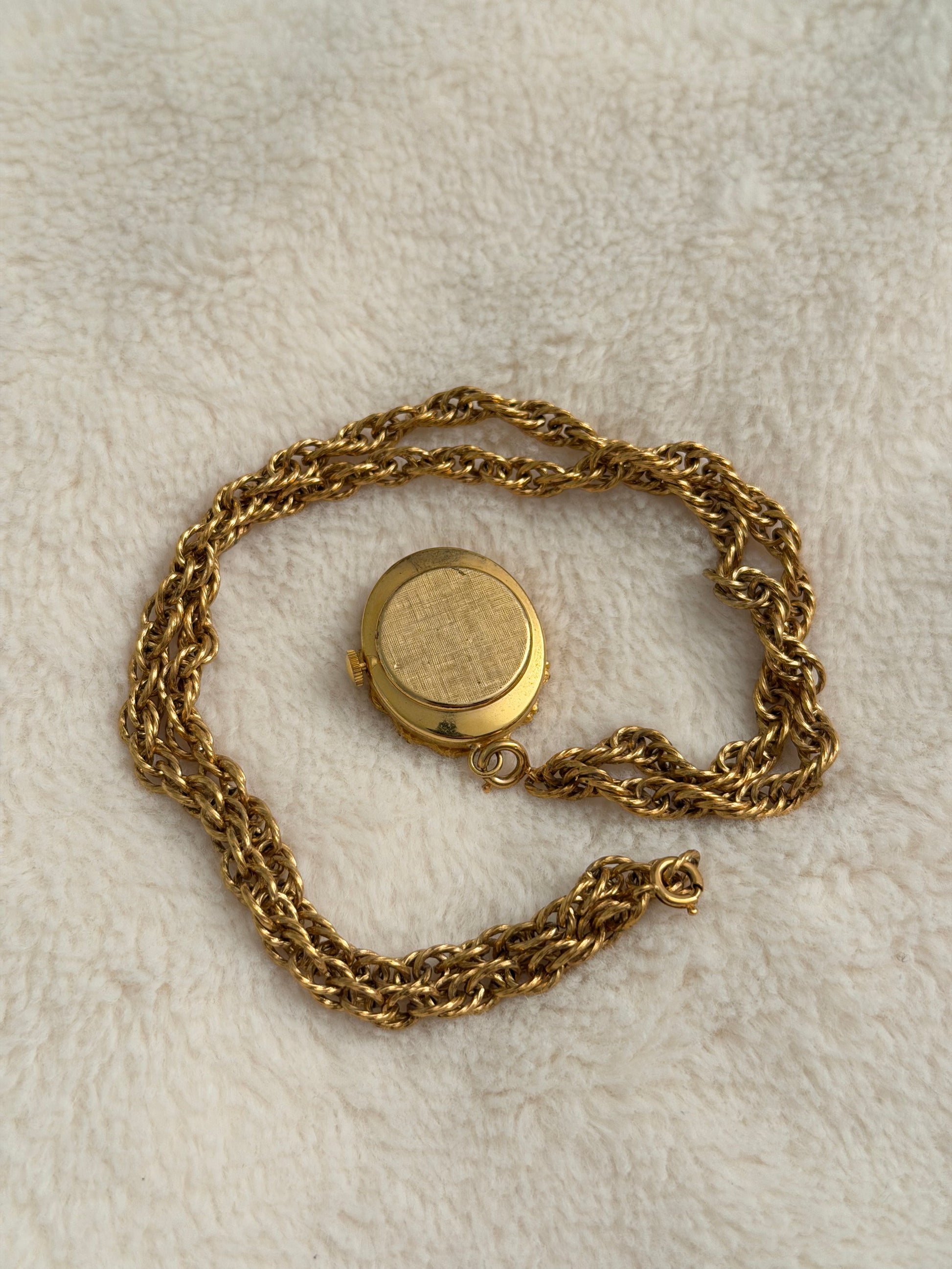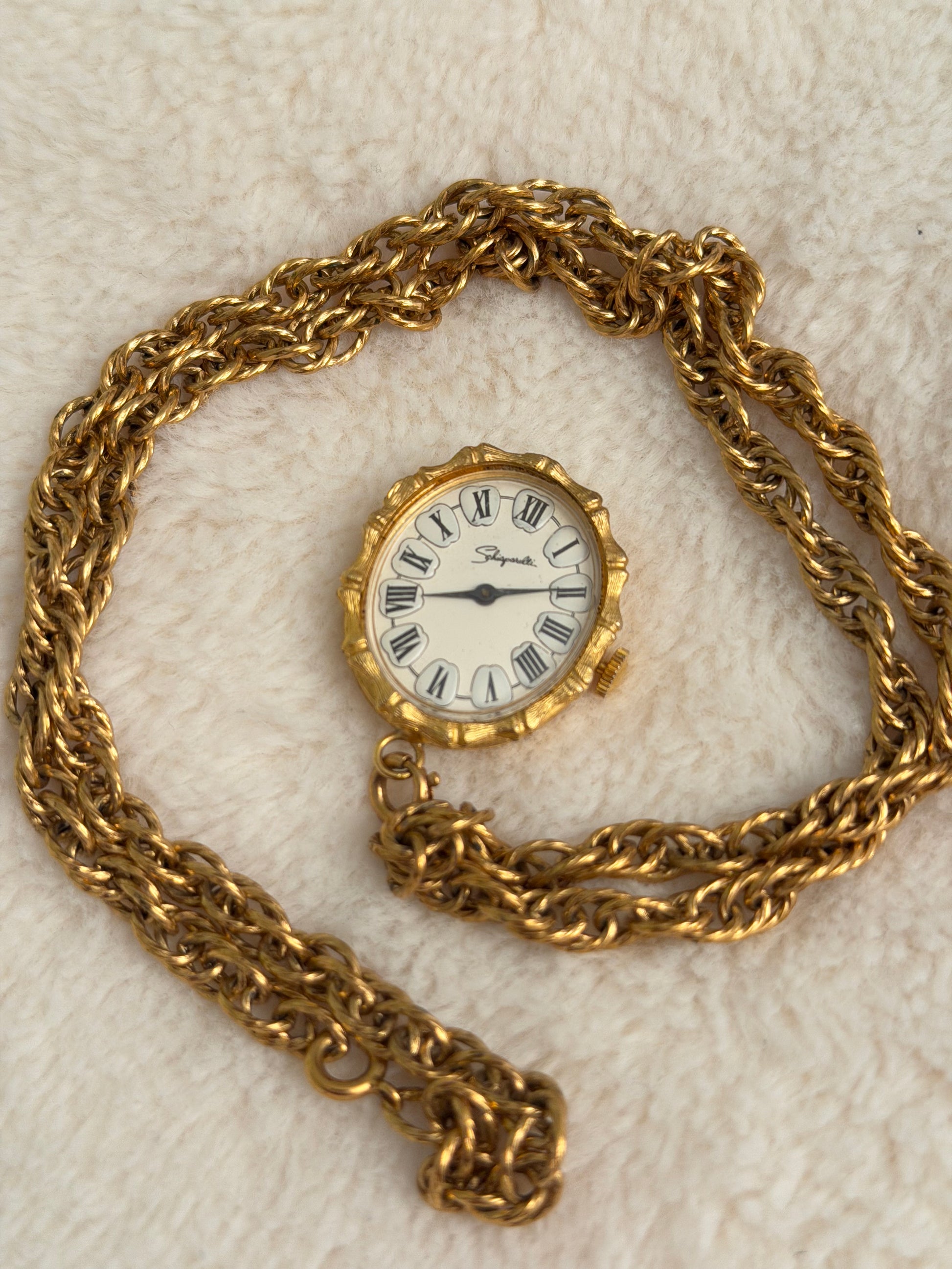 - notes: extremely RARE and possibly unique vintage schiaparelli vintage pendant watch! these were made in small quantities in the 50s are near impossible to find. the piece is currently functional and in fantastic cosmetic condition. a very special pendant want. Paired with a generic rope necklace (not schiaparelli)