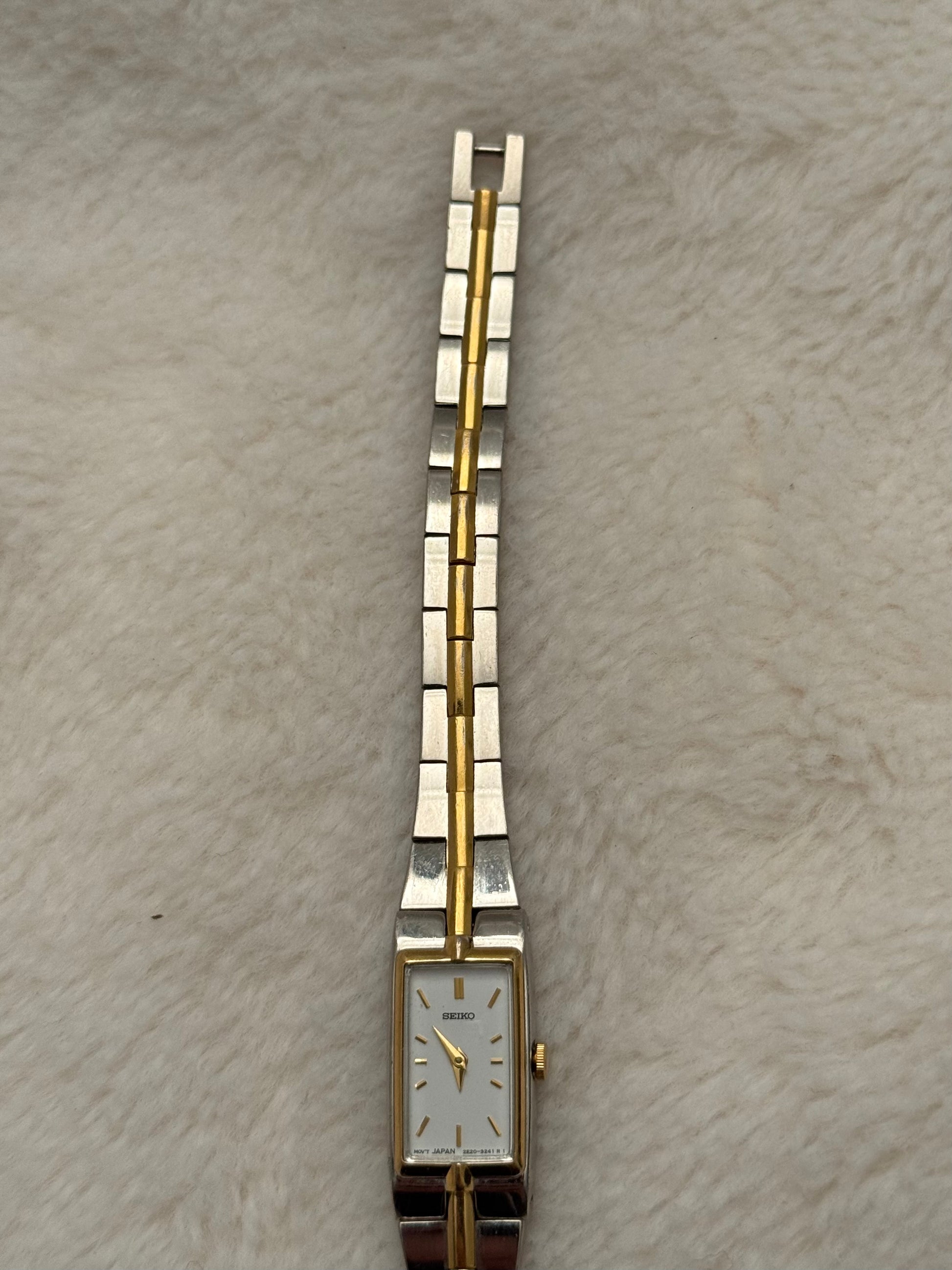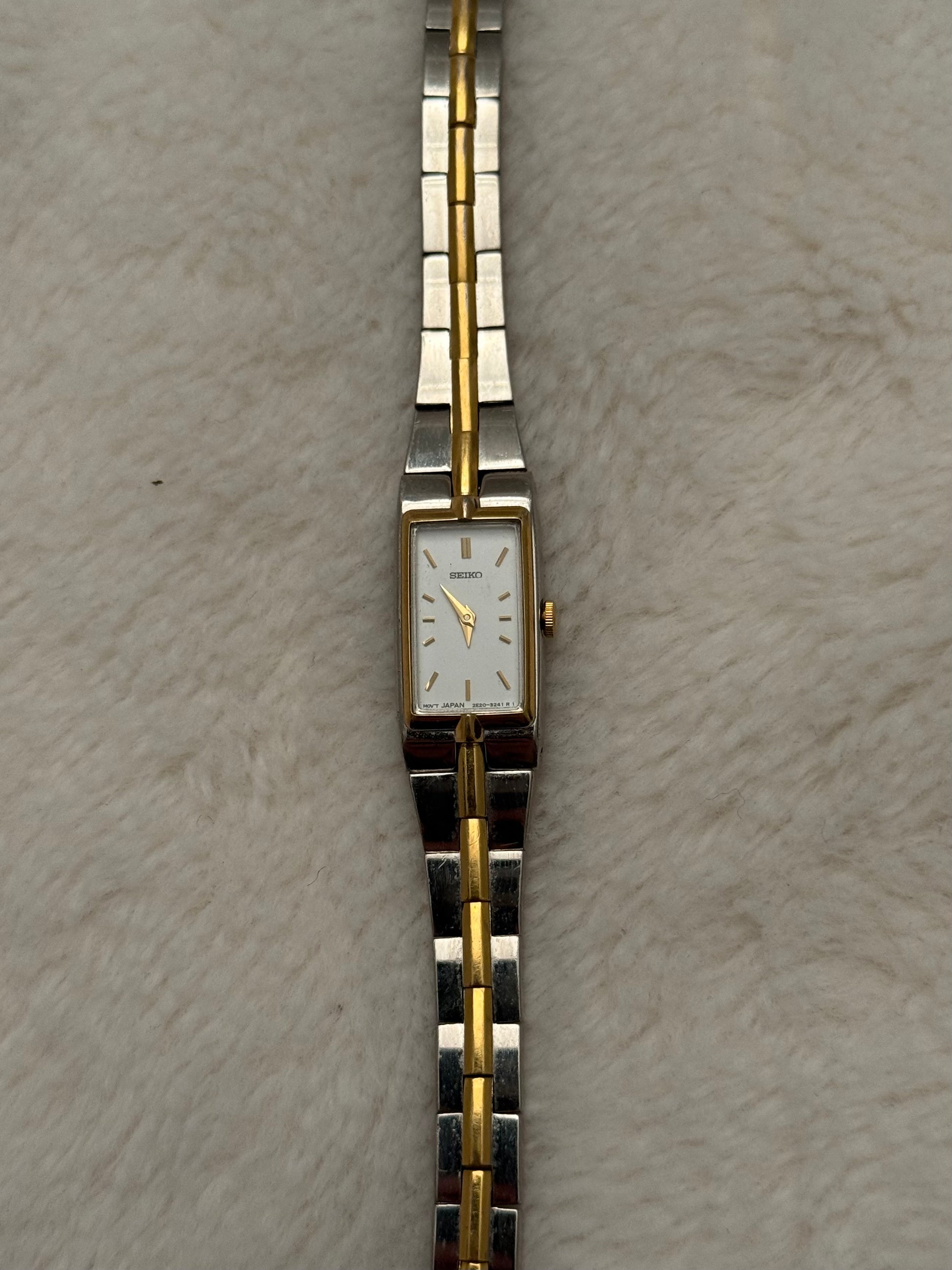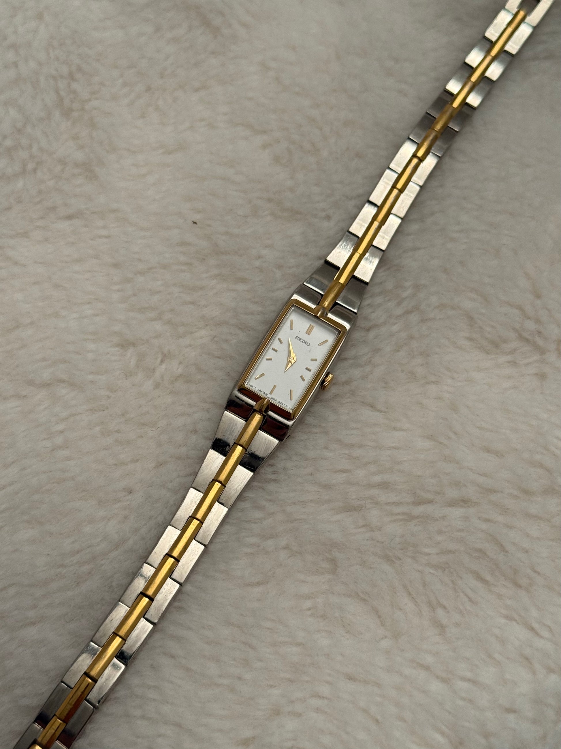 - notes: super beautiful and new vintage seiko two-tone piece with a integrated bracelet and clasp. Stunning white dial. smooth two-tone bracelet.