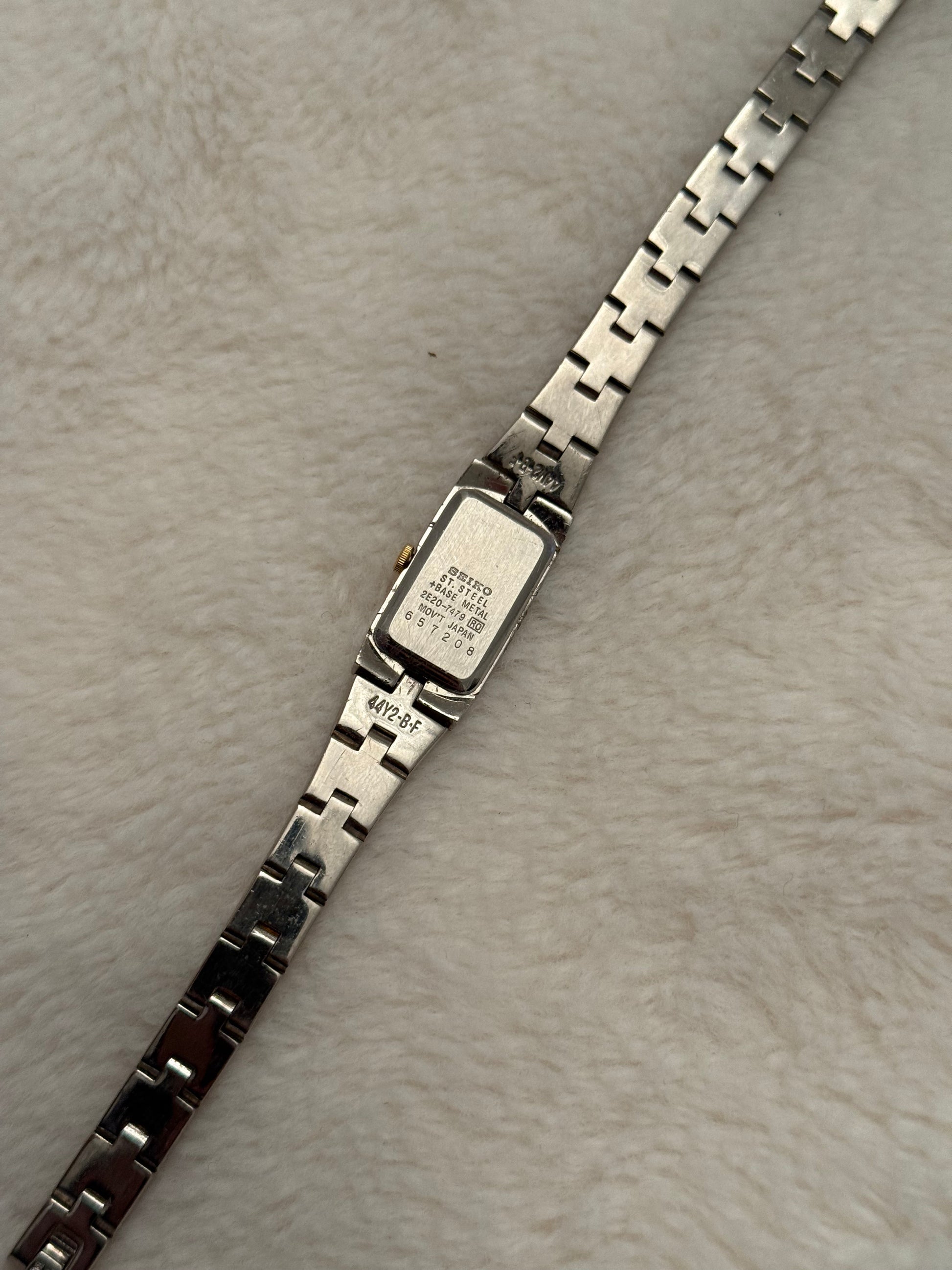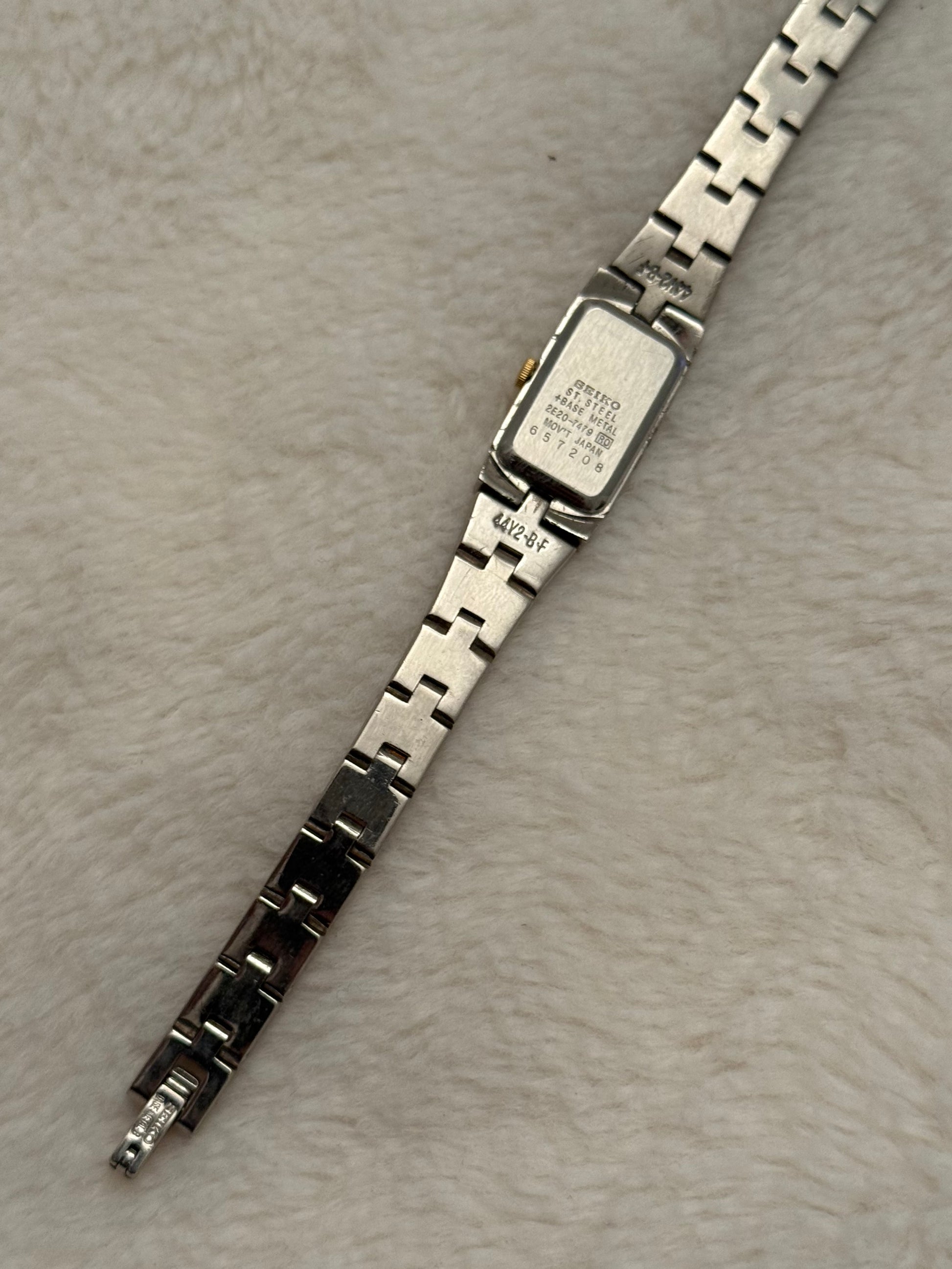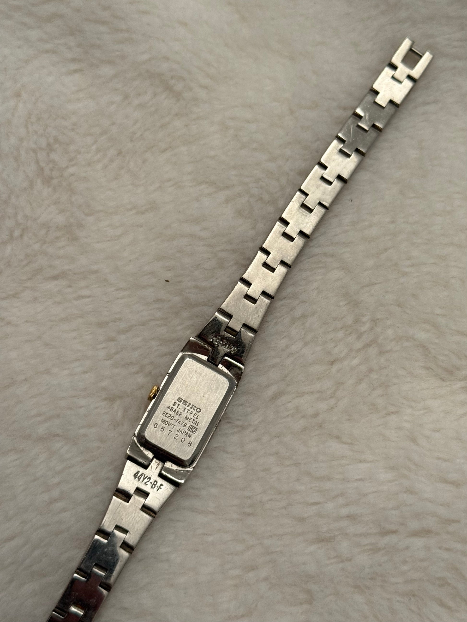 - notes: super beautiful and new vintage seiko two-tone piece with a integrated bracelet and clasp. Stunning white dial. smooth two-tone bracelet.