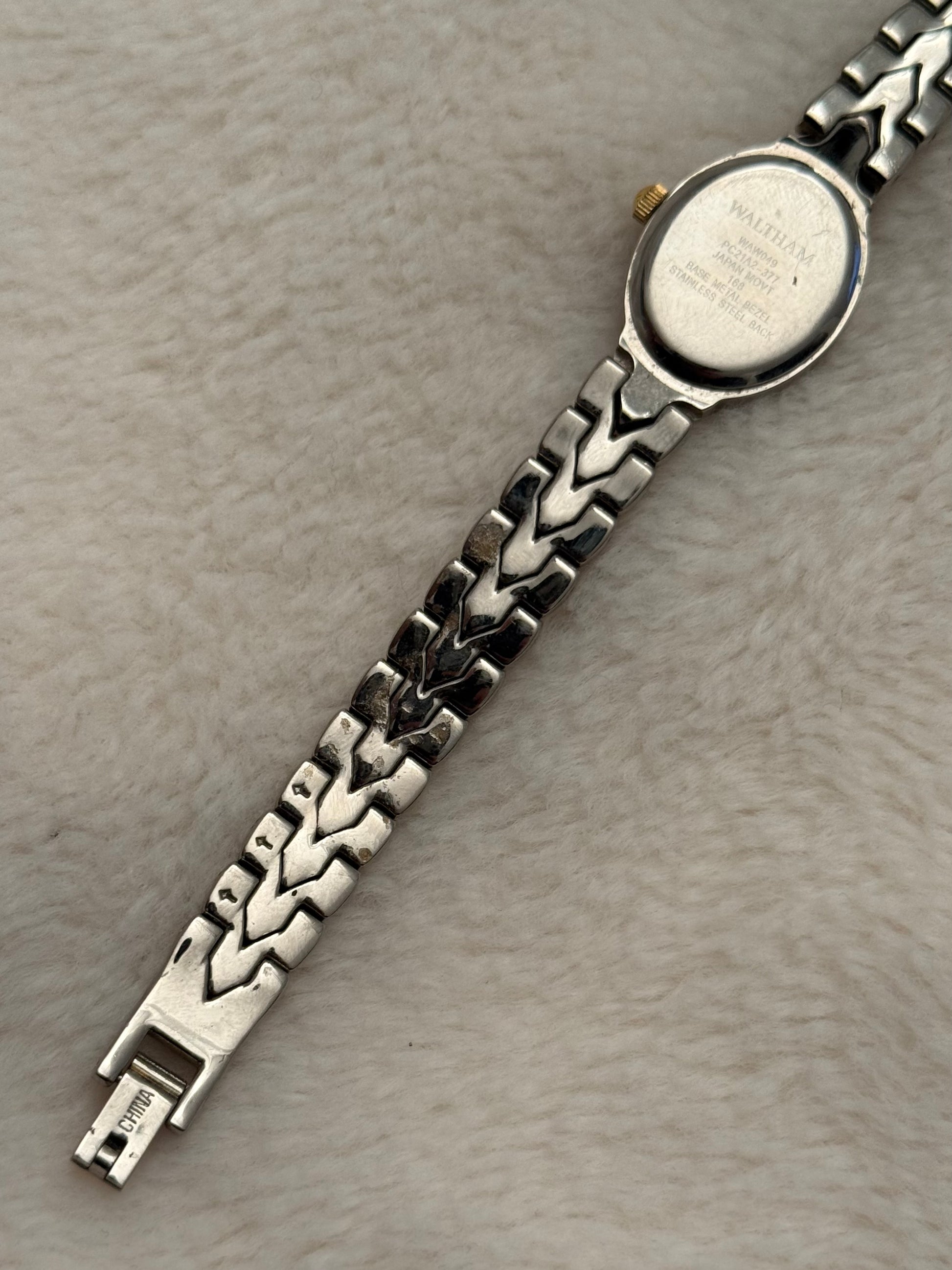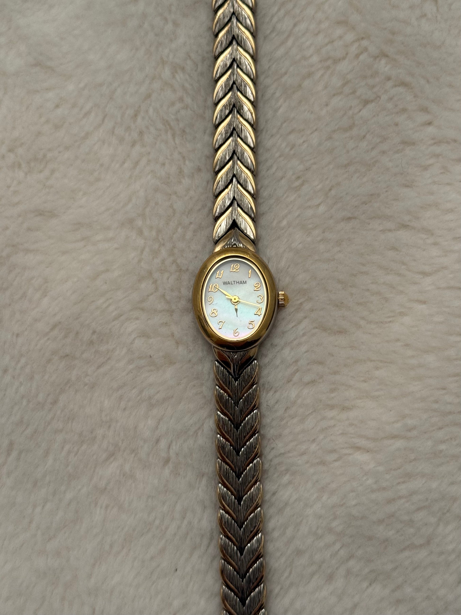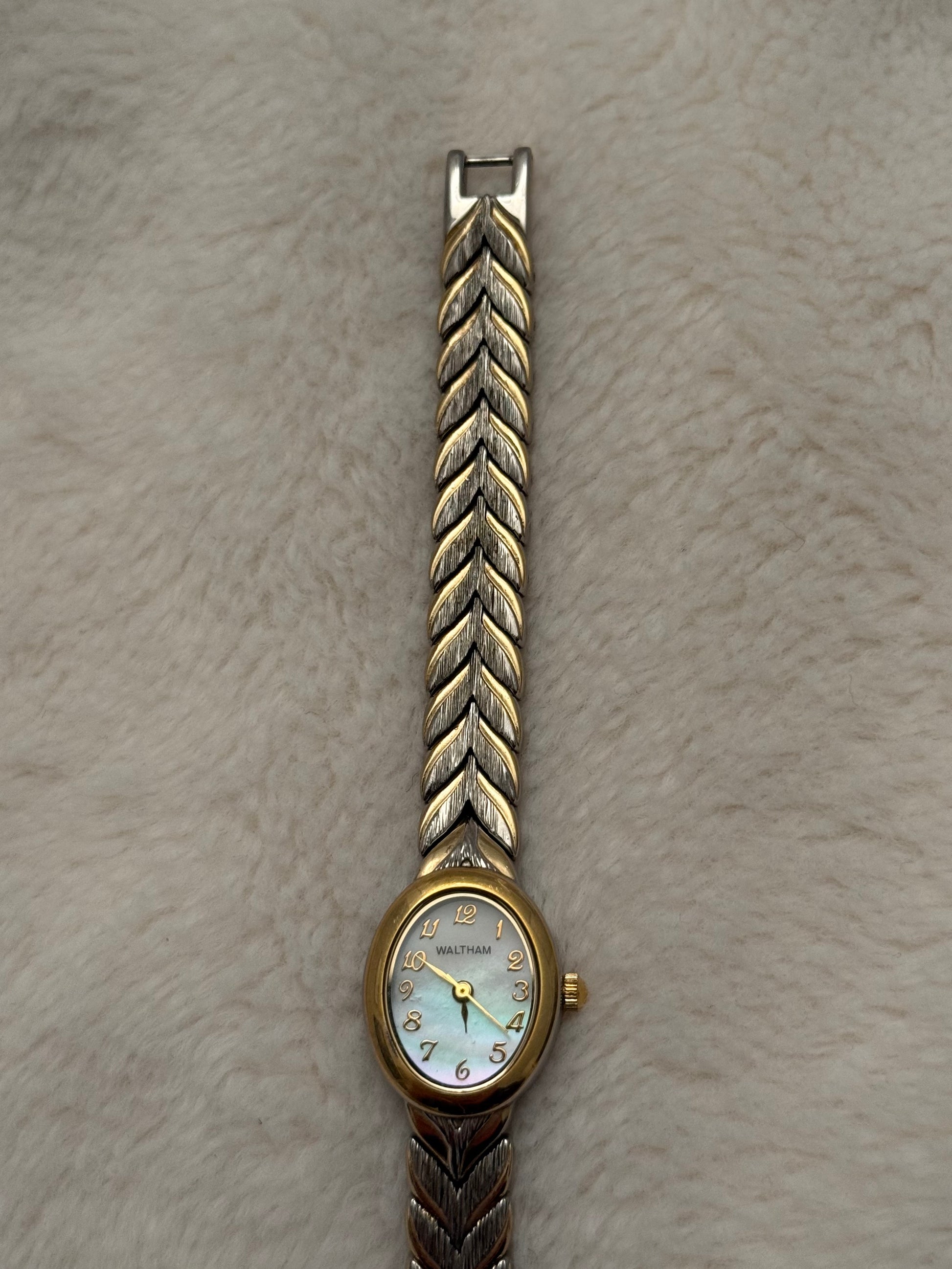 - notes: super beautiful and new vintage waltham two tone piece with a beautiful integrated and textured bracelet and clasp. Stunning mother of pearl dial.